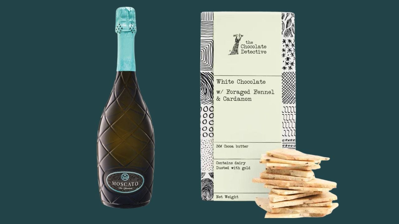 White ‘chocolate’ (yes, we know it’s not technically chocolate) is sweet, fatty, creamy and delicate, which makes it a natural match for the light, floral charm of Moscato.