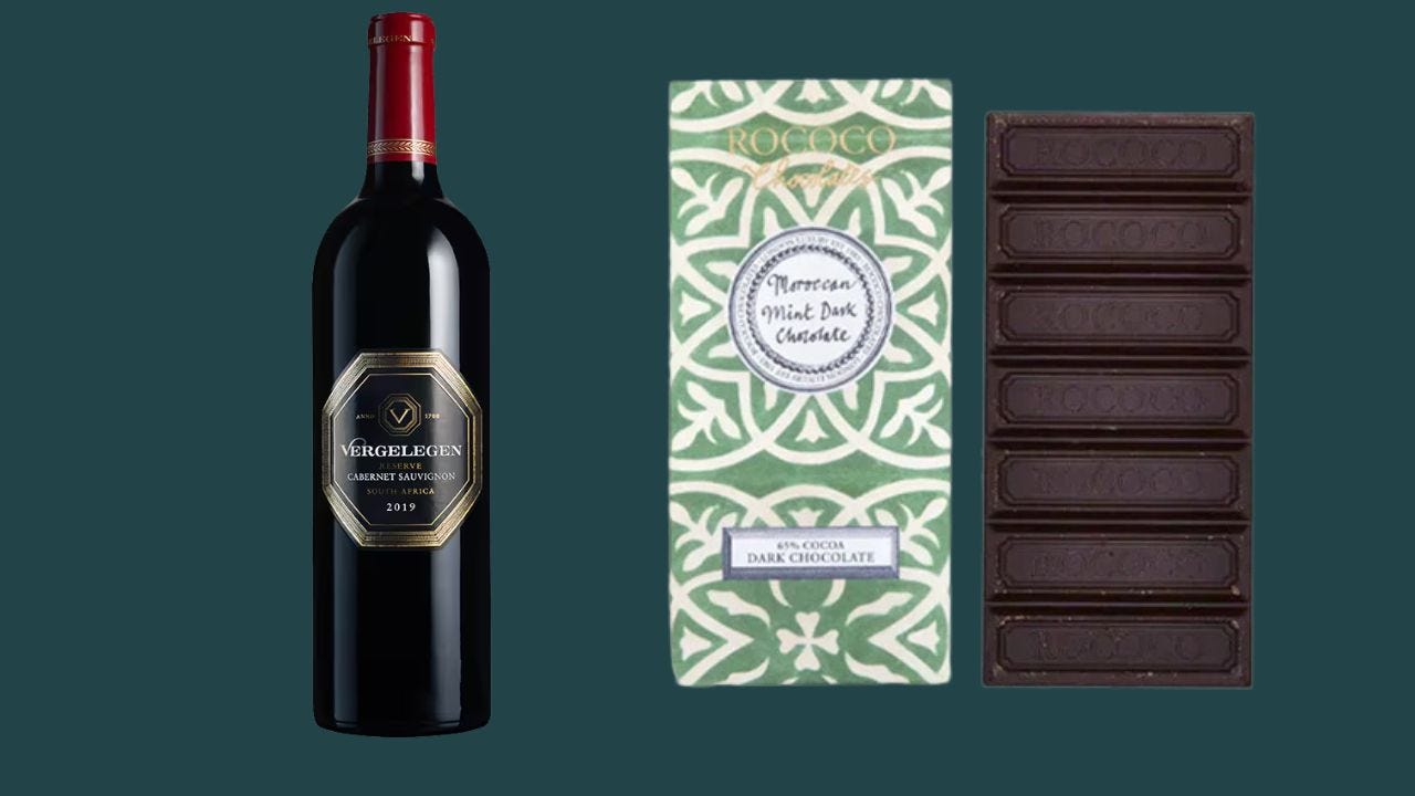 Dark mint chocolate, with its bittersweet depth and cooling herbaceous edge, is a striking match for a New World Cabernet from places like Chile & South Africa.