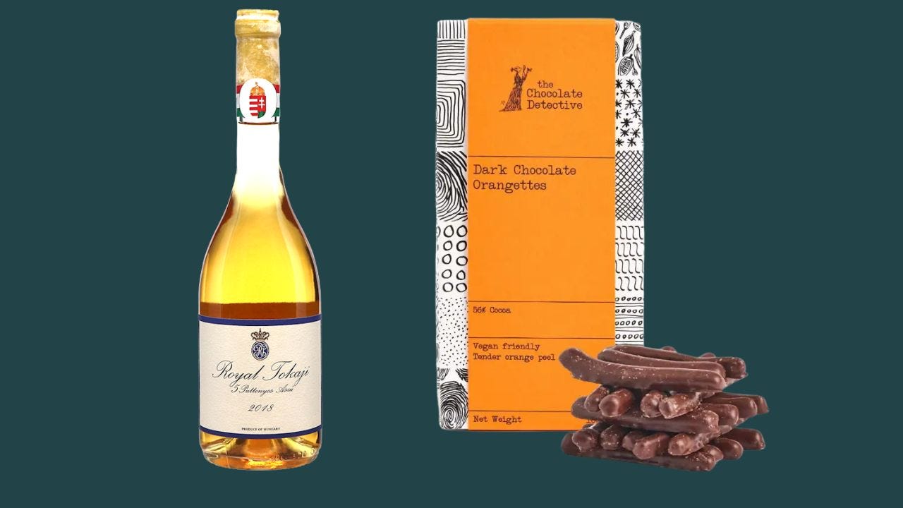 Both wine and chocolate share vibrant, zesty orange notes here balanced by sweetness and the Tokaji’s high acidity lift the richness of the chocolate.